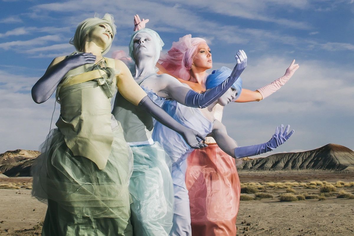 Since 2005, I have been collaborating with photographer Scott London (Rolling Stone, Vanity Fair, GQ, Elle Décor, Marie Claire, Outside, Sierra and National Geographic Traveler), as a scholar. He has provided many images for my book on the Burning Man festival. Last year, he documented my performance at Burning Man and featured my work in Rolling Stone. I designed and constructed three costumes inspired by the colors of the desert--sage green, agave blue, and desert rose. We spent a day at the Painted Desert/Petrified Forest to do a photoshoot. These images were then projected via hand-held projectors by the roaming performers on all the surfaces of the Mesa Art Center bringing the beauty of the desert back into the urban environment.