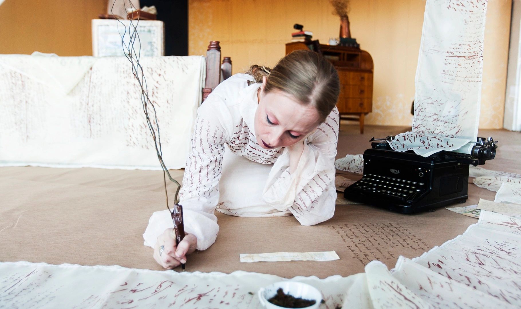 Loosely inspired by Virginia Woolf’s A Room of One’s Own and the concept of a ‘memory palace’ first attributed to the Greek poet Simonides (556-468 BC) and further developed by Giulio Camillo (1480-1544), Memory Room was a durational multi-media performance installation that investigates the relationship between women, writing, and memory. A ‘memory palace’ is a mnemonic system to spatially organize memories using specific ‘loci’ or spatial locations organized along a predetermined path. When items need to be remembered, one walks along the path to recall one memory at a time. Expanding upon Camillo’s concept of the ‘memory theatre’ or ‘theatres of memory,’ Memory Room layers a series of ‘memory palaces’ of women writers—Emily Dickenson, Zelda Fitzgerald, Simone de Beauvoir, Virginia Woolf, Audre Lorde, Anne Sexton, and Sylvia Plath among many others—all women who made an indelible mark on the world of literature. Over the course of three months, at designated times, a ‘memory-keeper’ marked the space with fragments from notebooks and journals of these women. The performance lasted until the entire space is filled with writing.
